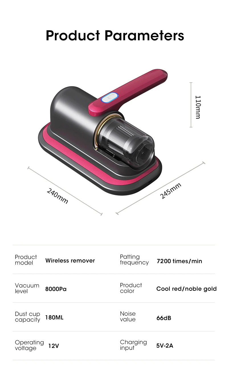 Der Matratzenreiniger hat eine Saugleistung von 12 kPa und einen 50-W-Motor. Der gezielte Matratzenstaubsauger entfernt Staub und Schmutz aus Textilien und reinigt Ihr Bett, Ihre Kissen und Ihren Teppich gründlich.