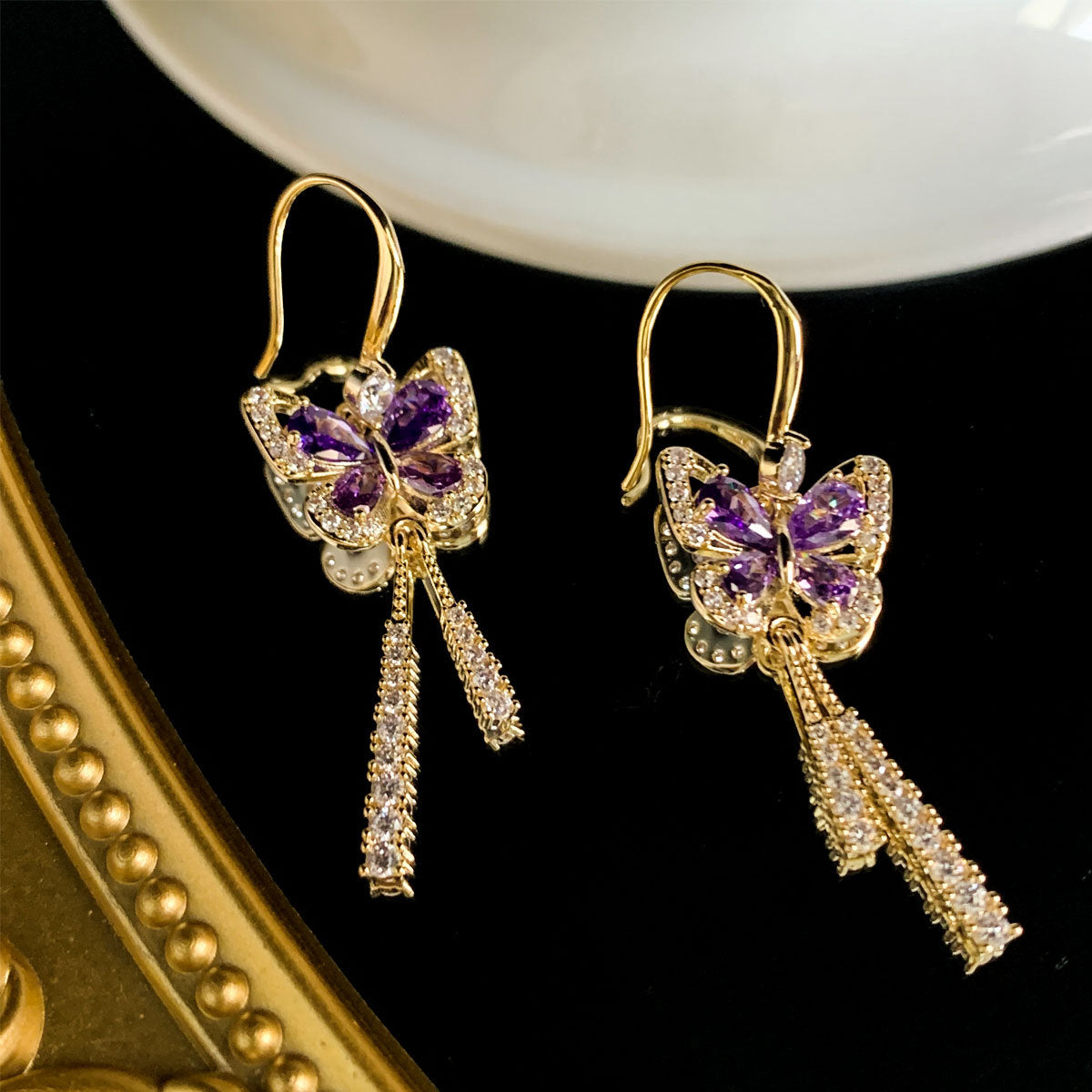 Die Schmetterlingsohrringe mit Quasten sind für exquisite Frauen gemacht, die Luxus und Geschmack schätzen. Perfekt, um jedem Outfit einen Hauch funkelnder Eleganz zu verleihen.