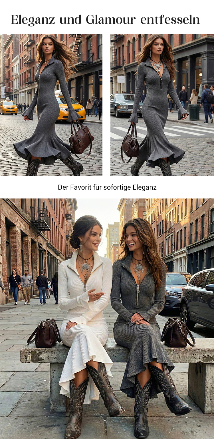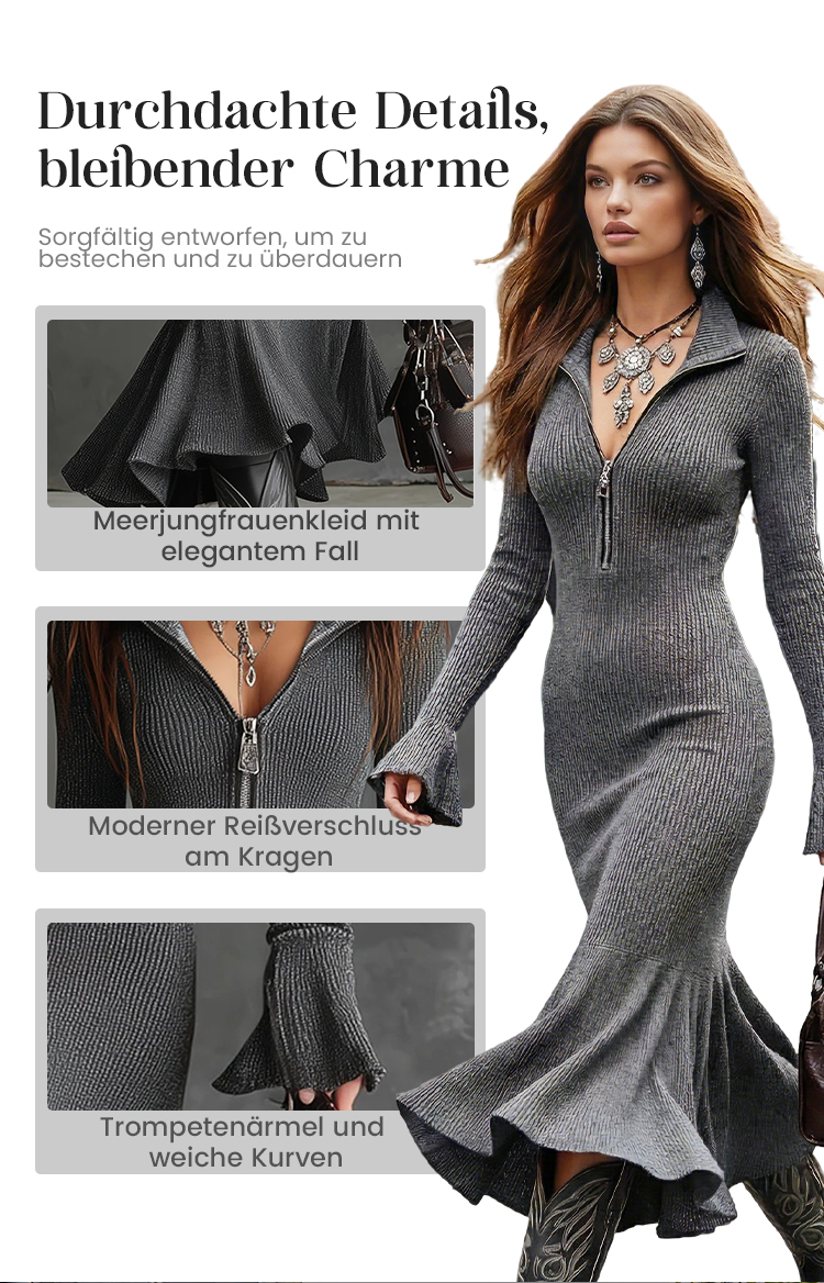 Damenrock mit Reißverschluss vorne, Kragen, Glockenärmeln und Fischschwanzausschnitt